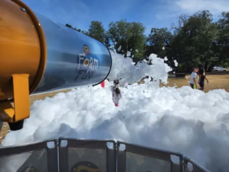 It's simple and easy, we'll only take up about 10' of your yard but our high powered stacker foam cannon can shoot up to 30' away, and it being on a swivel stand, the area coverage for foam is incredible! Non- toxic, hypo-allergenic, doesn’t stain, or hurt the environment! No messy clean up either. Foam parties come with an attendant to ensure proper set up and constant foam fun.