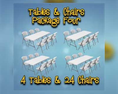 But what do you do about keeping all of your guests in the same place when it's time for something to eat? The tables and chairs packages we offer are the ideal solution. Each of the four tables in this event package is 72 inches long and 30 inches wide. They seat six people. In total, that's 24 people all safely accommodated and waiting patiently for their party food.